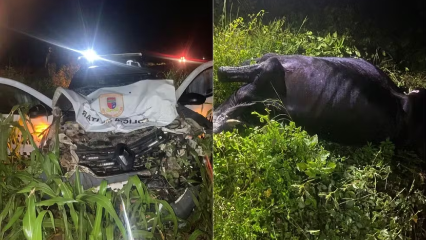 Uma viatura da Polícia Militar atingiu uma vaca e saiu da pista na BR-405, entre Mossoró e Apodi, na noite desta terça-feira (14). Nenhum policial ficou ferido. O animal morreu....