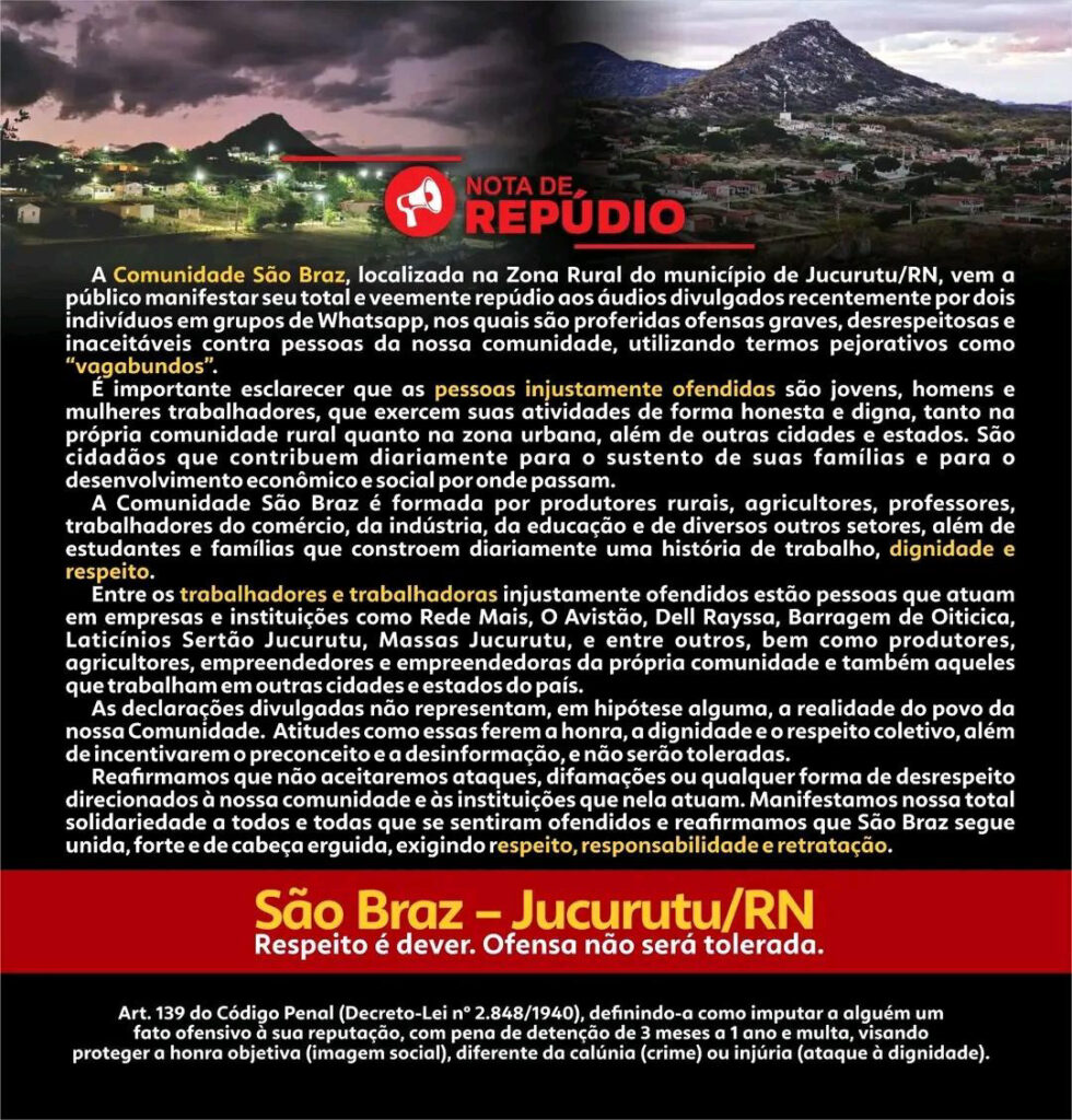 A comunidade do Sítio São Braz, localizada na zona rural de Jucurutu-RN, emitiu uma nota de repúdio após moradores relatarem terem sido alvo de ataques, ofensas e generalizações preconceituosas veiculadas...
