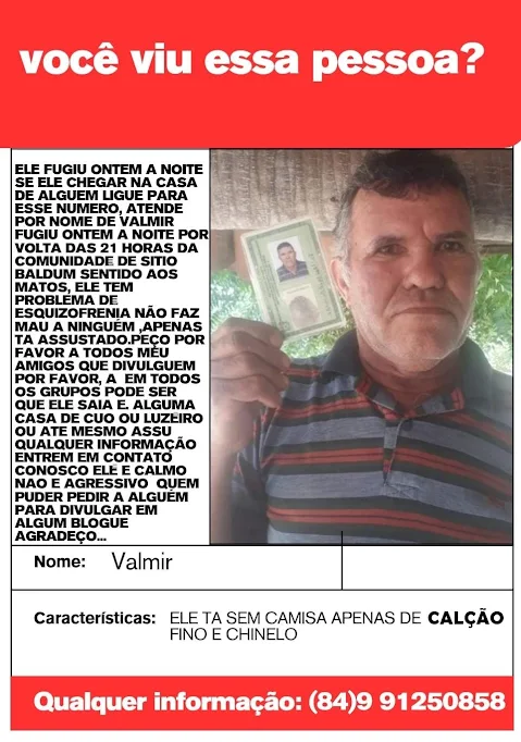 A família de um homem identificado como Valmir Alves de Queiroz está em busca de informações sobre seu paradeiro após seu desaparecimento na noite da ultima sexta-feira (14) . Segundo...