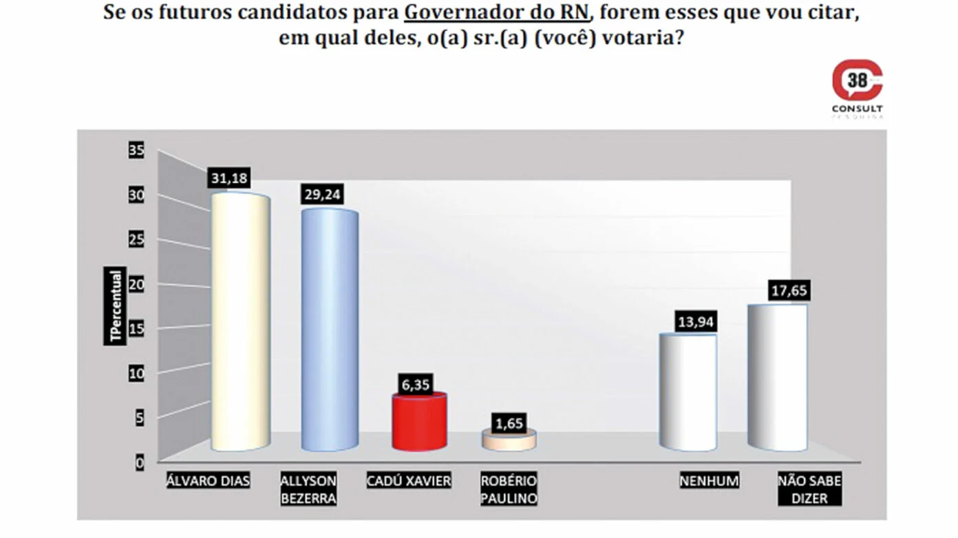 Com 31,18% das intenções de voto, Álvaro aparece na liderança, abrindo vantagem sobre o prefeito de Mossoró, Allyson Bezerra, que soma 29,24%.