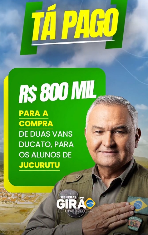 Atendendo a um requerimento do vereador Romualdo Teixeira, o deputado federal, General Girão confirmou em suas redes sociais que já está pago a destinação de R$800 mil para a compra de duas vans, modelo Ducato, para os alunos de Jucurutu.