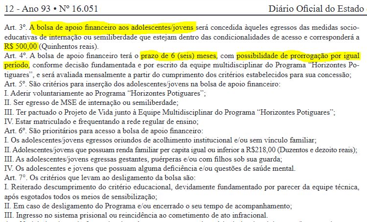 O governo do RN, sob o comando de Fátima Bezerra (PT), vai pagar uma bolsa de R$ 500 por mês a adolescentes e jovens que cumpriram medida socioeducativa de internação ou semiliberdade. A decisão foi oficializada pela Fundase/RN (Fundação de Atendimento Socioeducativo do RN) em instrução de serviço assinada pelo presidente da instituição, Herculano Ricardo Campos, dentro do programa “Horizontes Potiguares”.