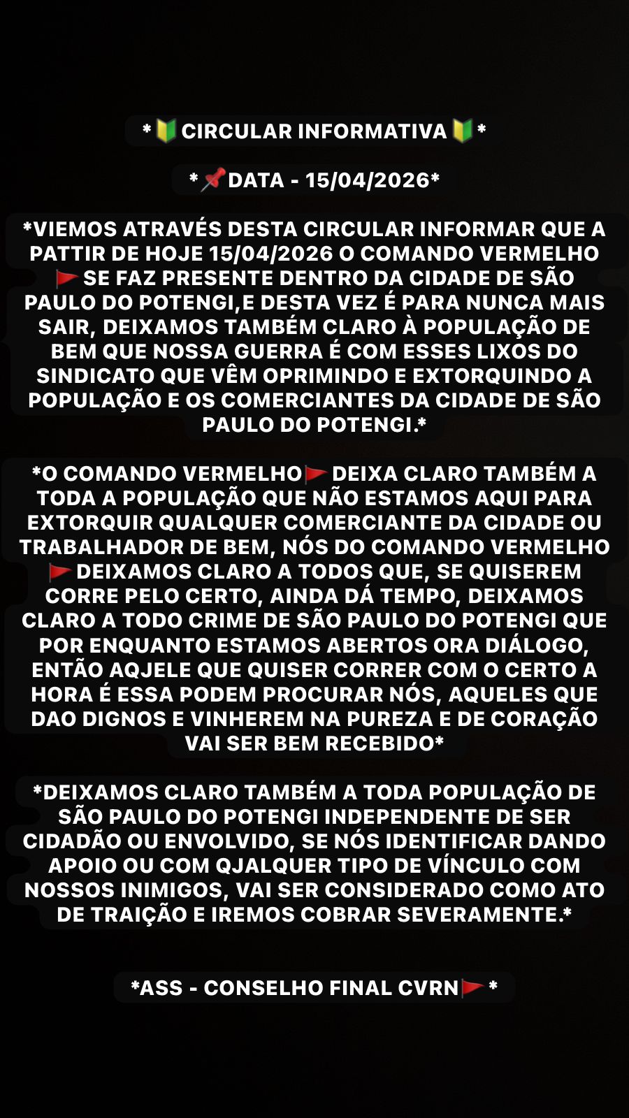 Na mensagem, os criminosos dizem que o alvo da guerra seria os rivais envolvidos com extorsões e ameaças contra comerciantes e a população.