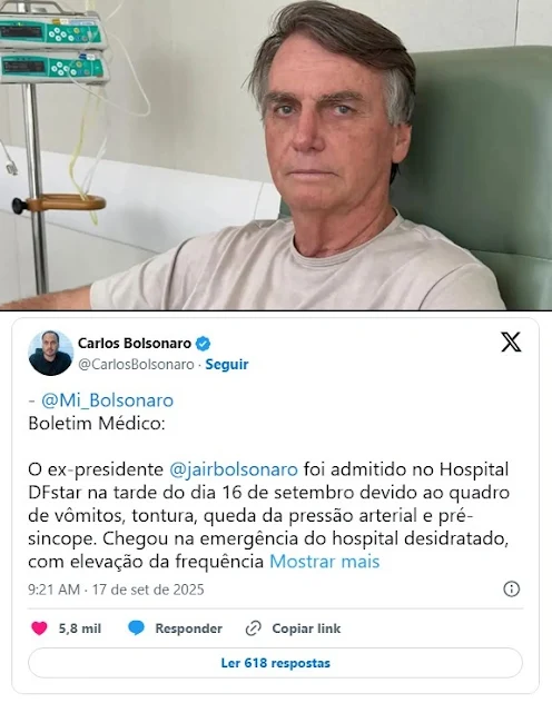 O Hospital DF Star divulgou nesta quarta-feira (17) um boletim médico atualizando o estado de saúde do ex-presidente Jair Bolsonaro (PL). Ele deu entrada na unidade na terça-feira (16), apresentando quadro de desidratação, frequência cardíaca elevada, pressão arterial baixa, vômitos e sensação de desmaio.