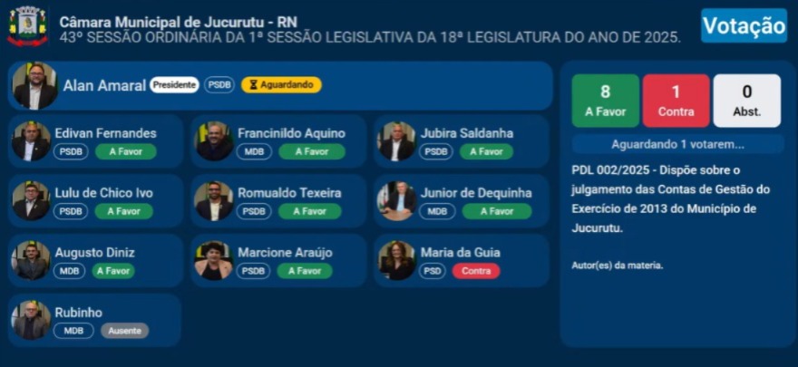 A Câmara Municipal de Jucurutu aprovou, nesta terça-feira, 16 de dezembro, as contas da gestão do ano de 2013 do ex-prefeito George Queiroz. A votação aconteceu em dois turnos.
