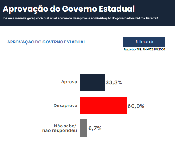 Levantamento do instituto Media Inteligência em Pesquisa questionou os eleitores do RN sobre a aprovação da administração da governadora Fátima Bezerra.