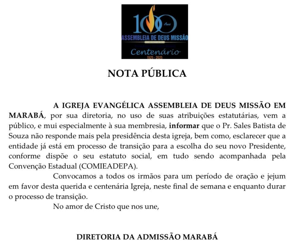 Em nota divulgada na sexta-feira (26), a Assembleia de Deus Missão informou: “O Pr. Sales Batista de Souza não responde mais pela presidência desta igreja”. O texto convoca membros para jejum e oração durante o fim de semana e o processo de escolha do novo.