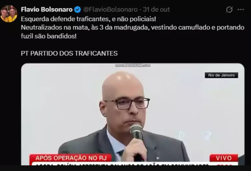 Na publicação em questão, o senador escreveu “PT Partido dos Traficantes”, em uma referência ao contexto de uma operação policial no Rio de Janeiro que deixou 118 bandidos e quatro policiais inocentes mortos, um total de 122 mortes.