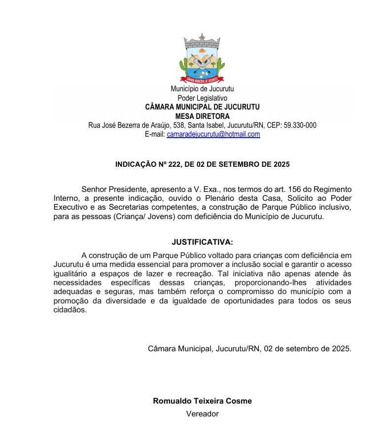 Na sessão ordinária desta terça-feira (02 de Agosto), na Câmara Municipal de Jucurutu, o vereador Romualdo Teixeira solicitou em requerimento ao Poder Executivo e as Secretarias competentes, a construção de um Parque Público inclusivo para crianças e jovens com deficiência no município.