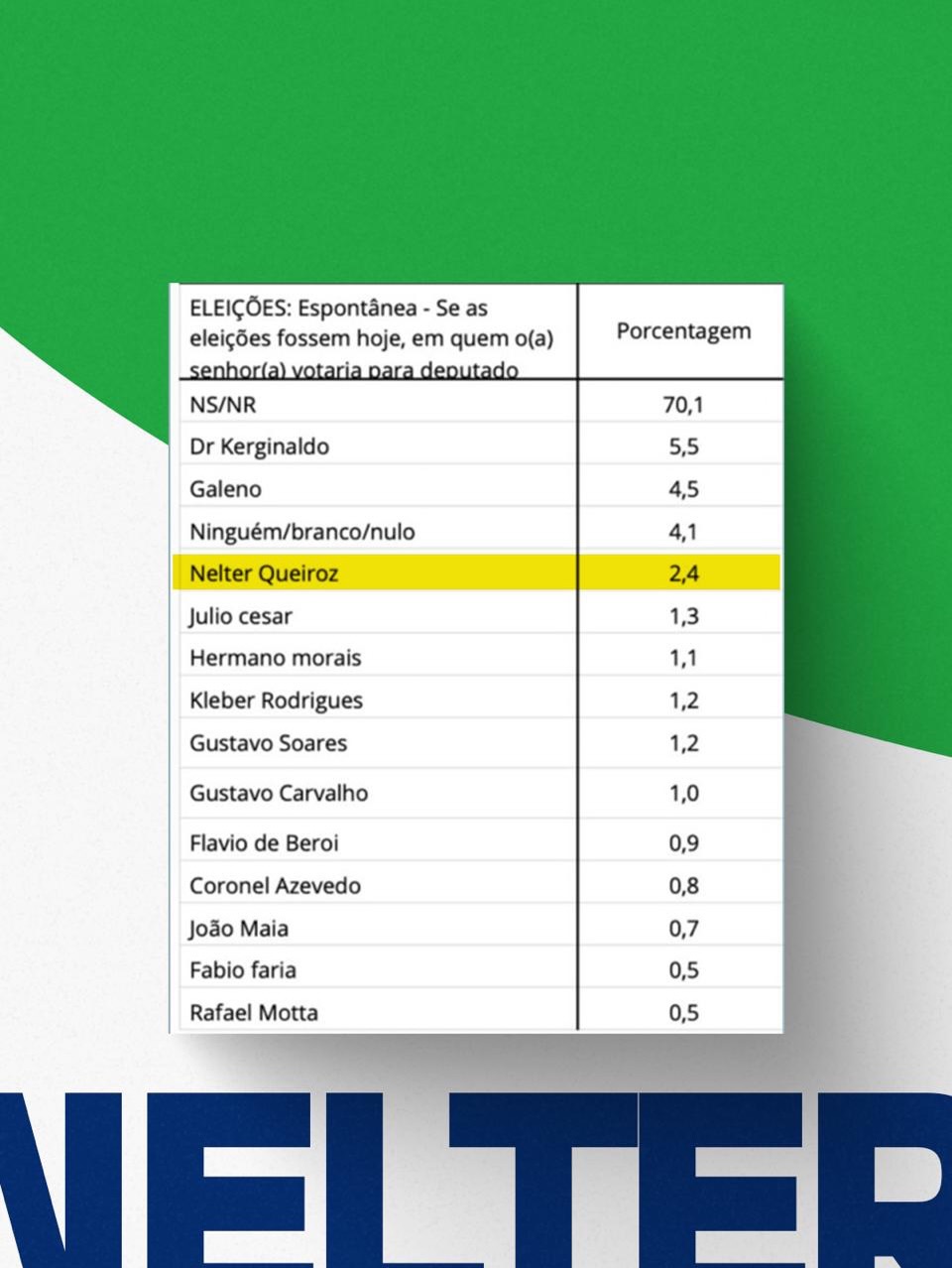 Na terceira colocação surge o deputado Nelter Queiroz, que registra 2,4% das citações espontâneas, figurando entre os nomes mais lembrados na pesquisa. Os demais pré-candidatos aparecem com percentuais menores, distribuídos logo após os três primeiros colocados.