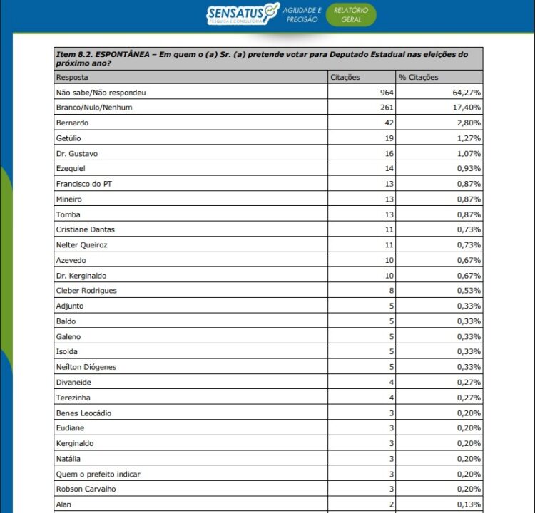 A pesquisa SENSATUS ouviu 1.500 eleitores entre os dias 16 e 19 de outubro. A margem de erro é de 2,53 pontos percentuais para mais ou para menos.