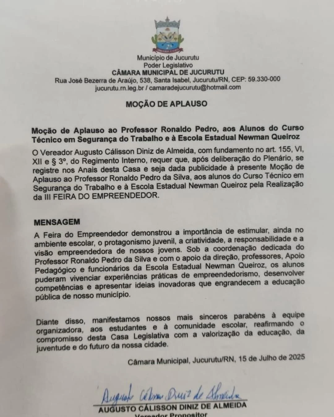 Na noite desta terça-feira 08 de Julho de 2025 na Câmara Municipal de Jucurutu, o Professor Ronaldo Pedro recebeu uma moção de aplauso proposta pelo Vereador Augusto Diniz (MDB).