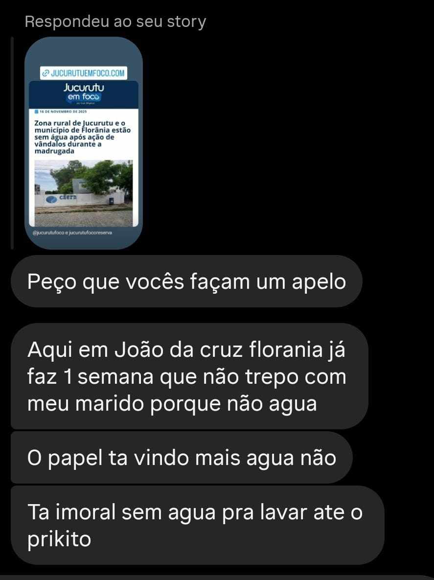 Uma moradora ainda entrou em contato com nossa redação pelo direct do nosso Instagram, alegando estar sem água “pra lavar o prikito”, segundo comentado por ela, já faz algumas semanas que não pratica sexo com seu marido pelo fato de não ter água para se banhar.