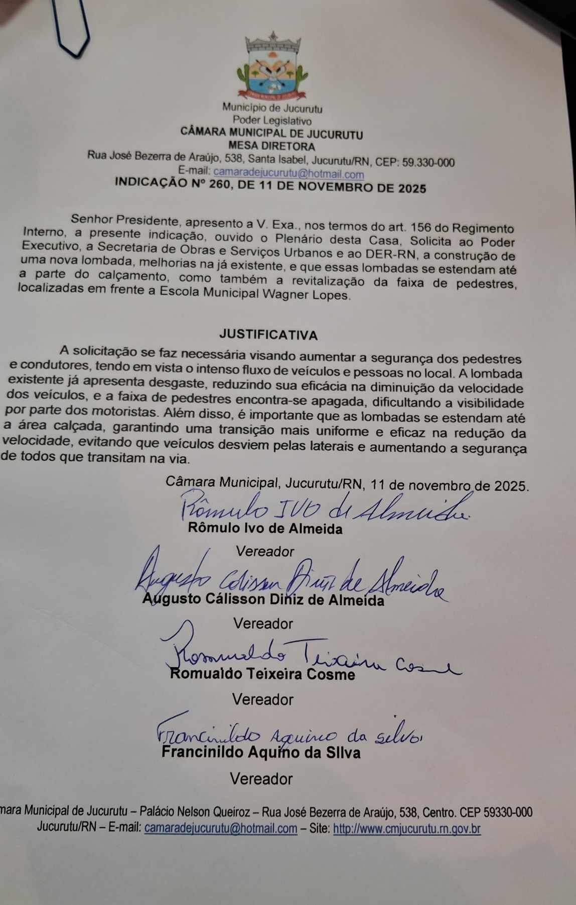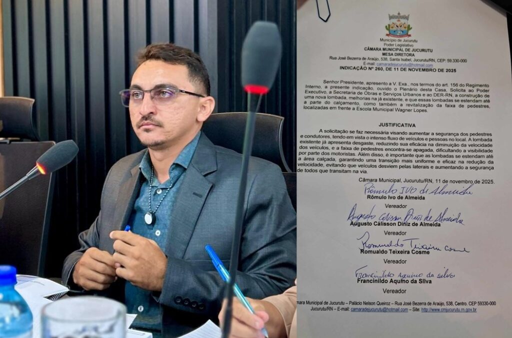 Na sessão ordinaria desta terça-feira, 11 de Nomvebro de 2025, realizada na Câmara Municipal De Jucurutu, os vereadores Augusto Diniz, Romualdo, Francinildo e Lulu, apresentaram uma indicação em conjunto, solicitando a construção de uma lombada, melhorias na já existente e revitalização da faixa de pedestres que ficam em frente à Escola Wagner Lopes.