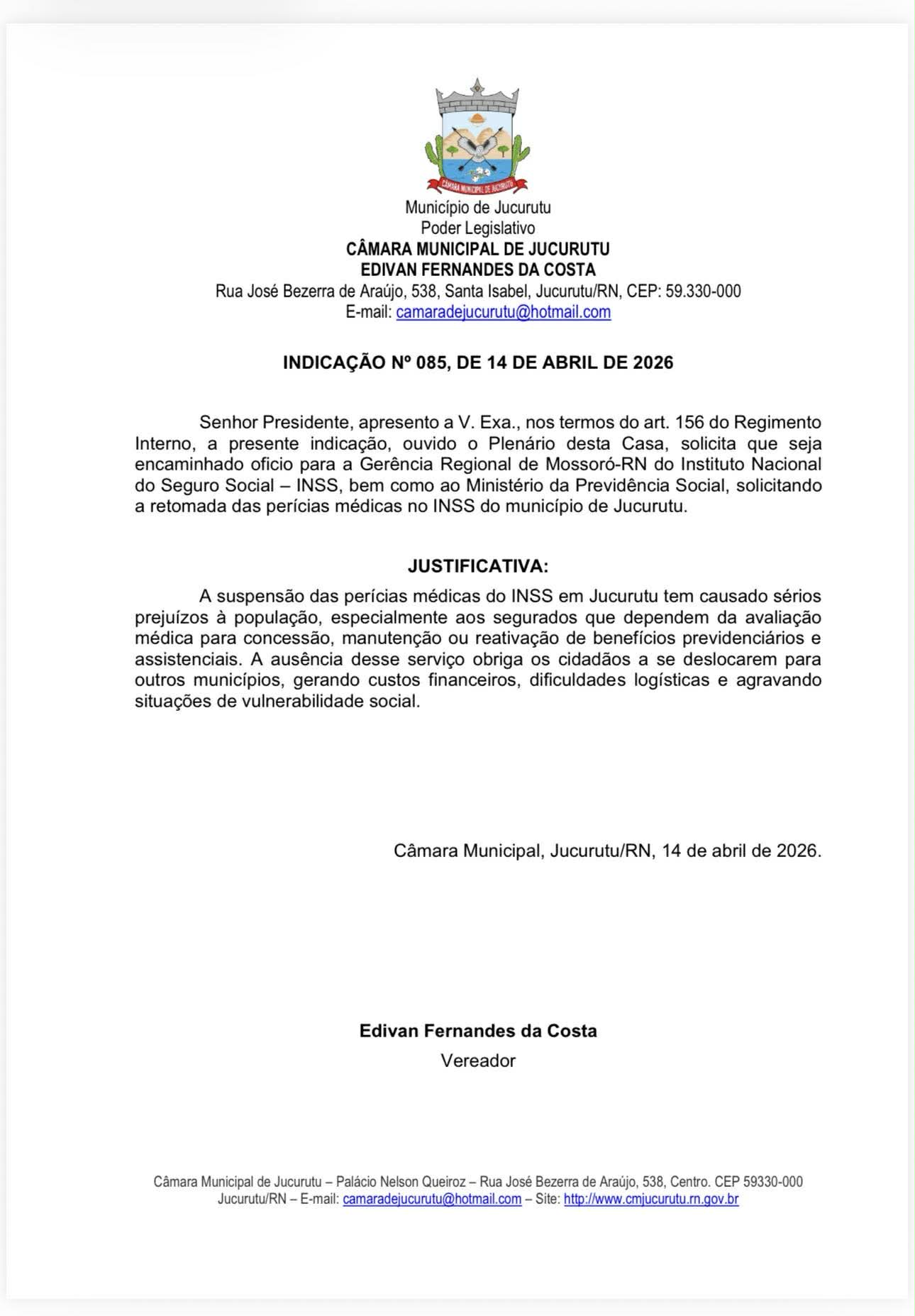 O parlamentar solicitou o encaminhamento de ofício à Gerência Regional de Mossoró do INSS e ao Ministério da Previdência Social, pedindo a retomada das perícias médicas no posto do INSS de Jucurutu.