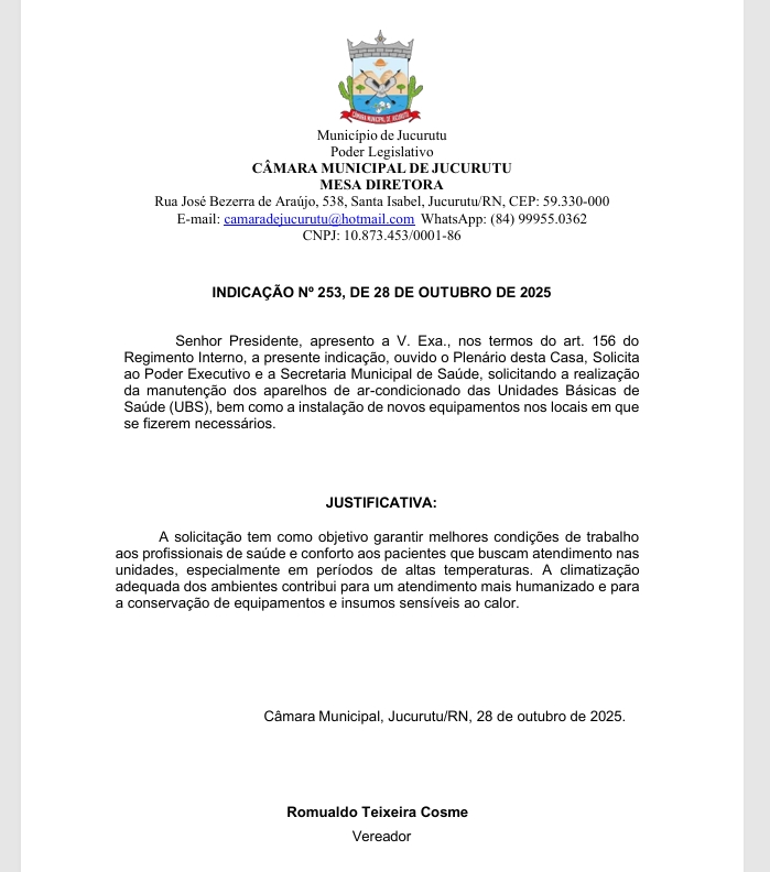 Na sessão ordinária realizada nesta terça-feira 28 de Outubro, na Câmara Municipal de Jucurutu, o Vereador Romualdo Teixeira em forma de indicação, solicitou ao Poder Executivo e a Secretaria Municipal de Saúde a manutenção dos ares-condicionados das UBS do município e também a instalação de novos equipamentos.