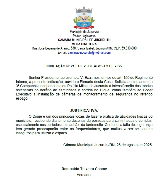 Na sessão ordinária realizada na Câmara Municipal de Jucurutu, nesta terça-feira 26 de Agosto de 2025, o Vereador Romualdo Teixeira solicitou ao Comando da Polícia Militar do Município a intensificação das rondas ostensivas no horário de caminhada e corrida no Dique, como também ao Poder Executivo a instalação de câmeras de monitoramento de segurança no referido espaço.