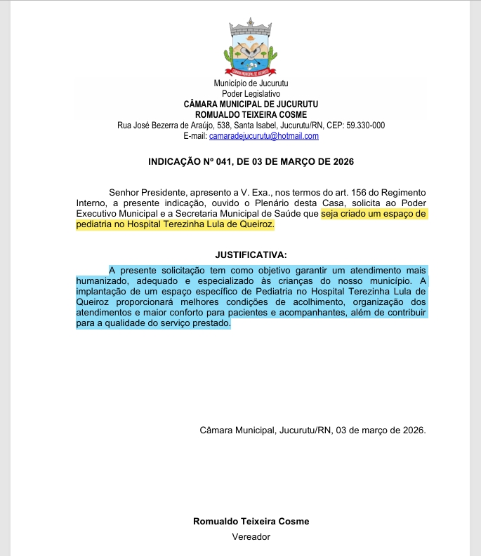 Na sessão ordinária desta terça-feira (03 de Março), na Câmara Municipal de Jucurutu, o vereador Romualdo Teixeira apresentou uma indicação solicitando ao Poder Executivo e à Secretaria Municipal de Saúde a criação de um espaço exclusivo de pediatria no Hospital Terezinha Lula de Queiroz.